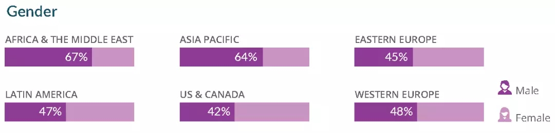 从地区来看,非洲地区、亚太地区男生比例高一些,欧美、拉美则女性稍多。