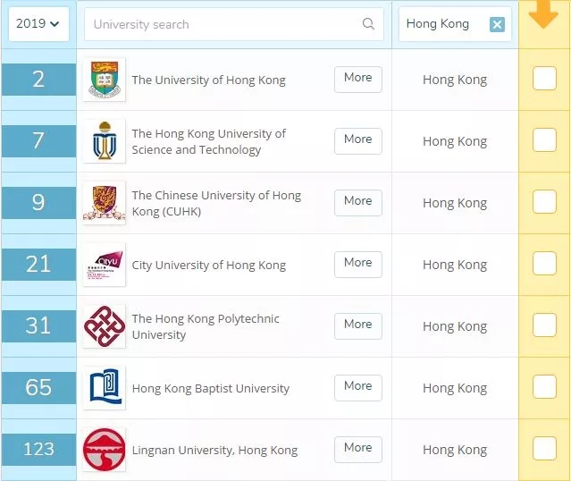 今年香港的大学排名整体也在提升,2018年,香港大学居亚洲第3,2019年排名居亚洲第2,紧随其后的分别是香港科技大学、香港城市大学等。