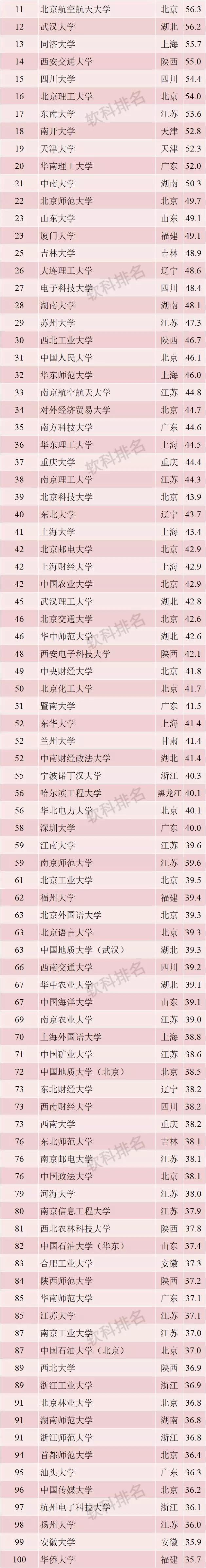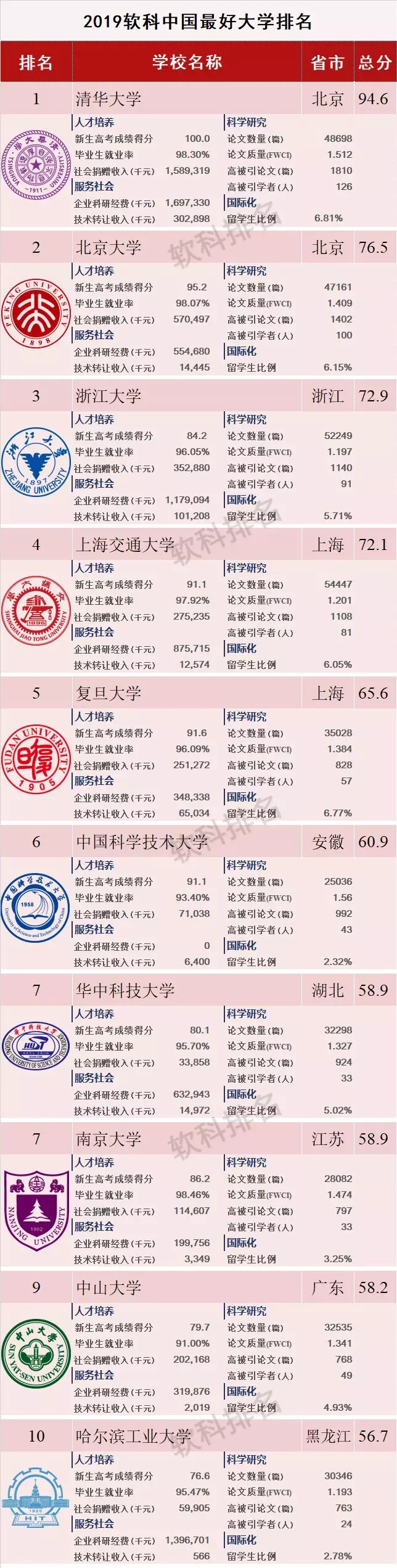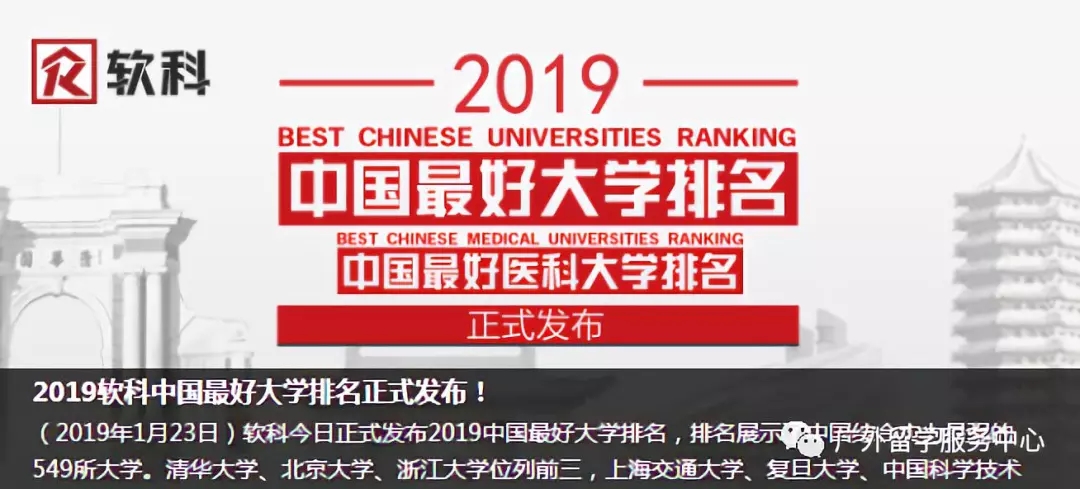 2019年1月23日,软科正式发布2019中国最好大学排名,排名展示了中国综合实力最强的549所大学。清华大学、北京大学、浙江大学位列前三,上海交通大学、复旦大学、中国科学技术大学、华中科技大学/南京大学、中山大学、哈尔滨工业大学依次排在4到10名。