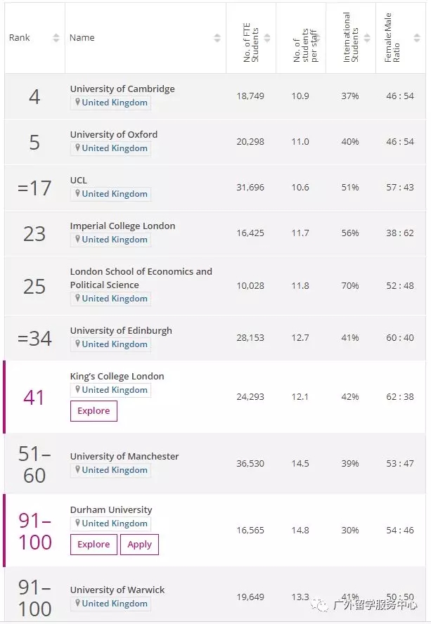 英国去年上榜9所学校,今年多了一所,杜伦大学,完成前10梦想,实力证明自己。排名考前的学校变动幅度不大,唯有原先前90名的华威大学,落至91-100名之间。
