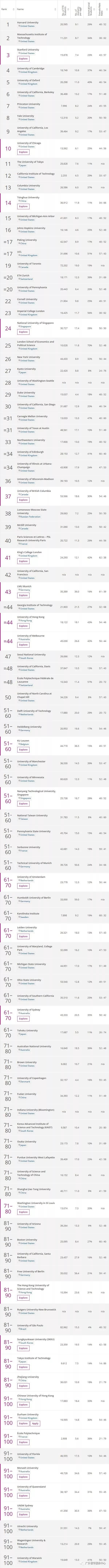 排名前10名大学中8所来自美国,哈佛大学领跑、麻省理工学院和斯坦福大学分别为第二和第三名。前100名中,42所大学来自于美国,10所大学来自于英国,中国有10所大学进榜,澳大利亚有6所大学进榜。