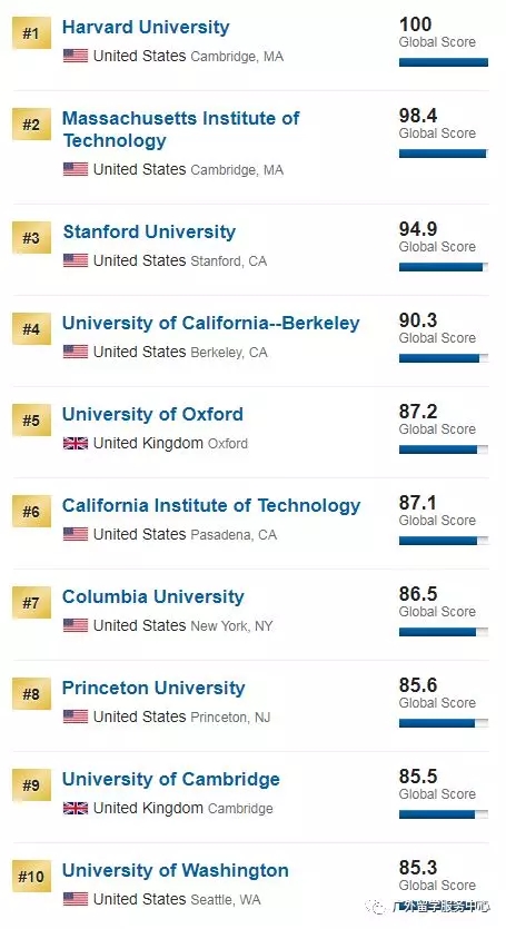 虽然榜单TOP10成员与去年相同(哈佛稳居第1,麻省理工学院、斯坦福大学位列2、3位,加州大学伯克利分校紧随其后排在第4,牛津第5,加州理工、哥大、普林斯顿、剑桥大学、盛顿大学紧随其后,位列前10),但不同的是,TOP10中英国剑桥大学、美国哥伦比亚大学和普林斯顿大学的名次跟去年相比发生了变化。剑桥由去年的第7名落至第9名,哥伦比亚大学和普林斯顿大学各前进1名,分别位列第7、第8。
