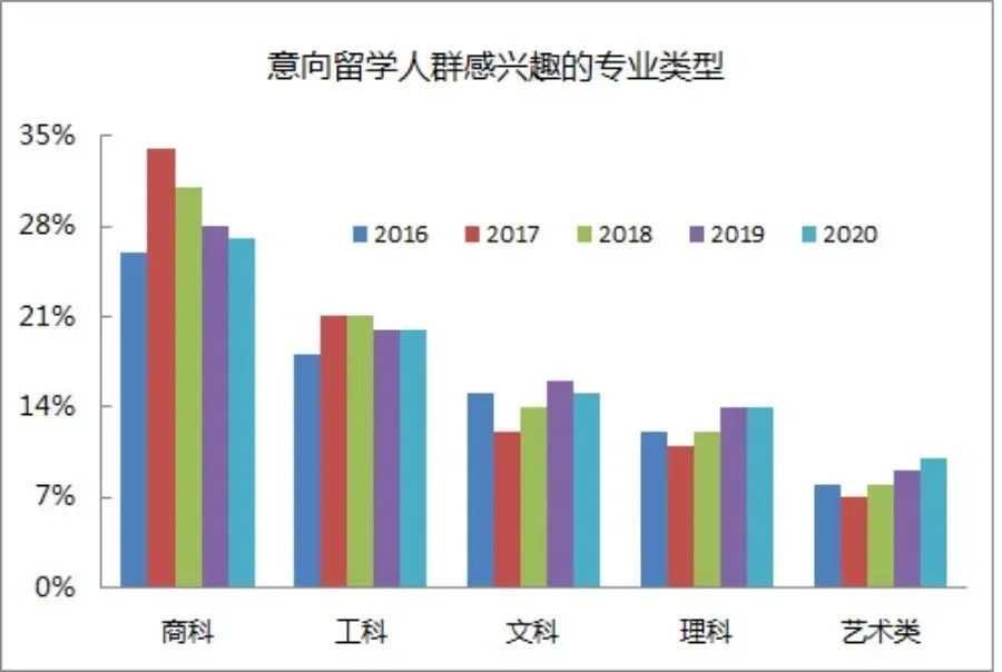同时,英国研究生阶段受欢迎,美国本科及以下阶段受欢迎。数据还显示,商科仍旧是最热门的意向留学专业,但其热度从2017年的34%占比下降到了今年的27%,呈现出连年下降趋势,理科、艺术类专业的热度则开始上升。