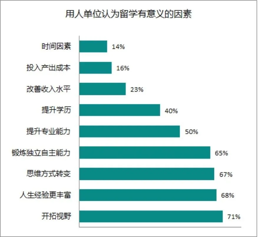 而据长远规划来看,开阔视野、思维方式转变、丰富人生经验等方面作为留学生们未来发展必不可少的软性实力,而名校背景及语言能力也是留学生在未来就业时有力的竞争手段。