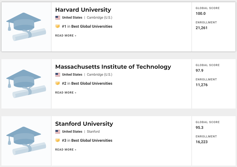 今年TOP10榜单中,美英两国名校继续霸榜!排名前三甲哈佛大学、麻省理工学院、斯坦福大学,全都是美国的高等院校。前十中除了来自英国的牛津、剑桥分别位列第5、第9(共2所),其余8所全部来自美国。