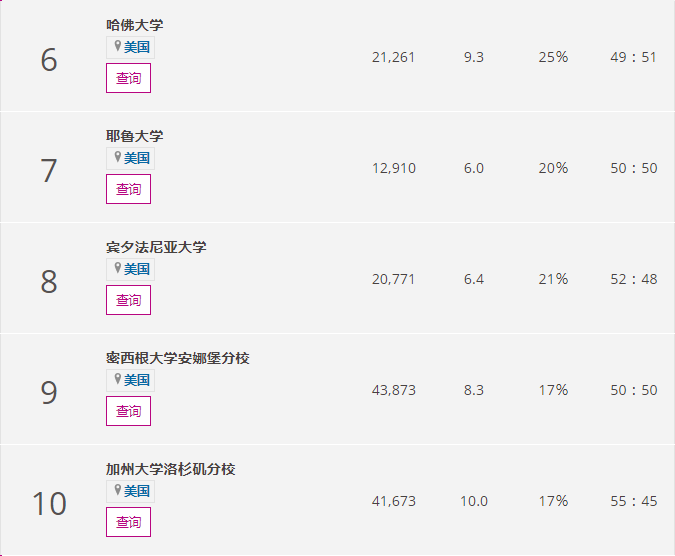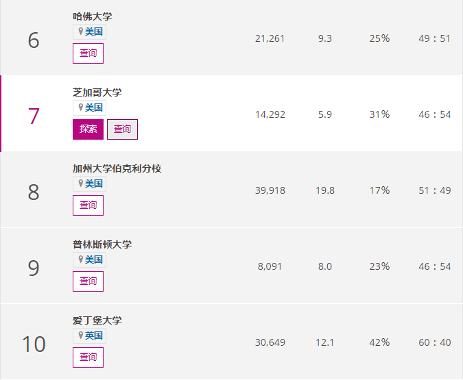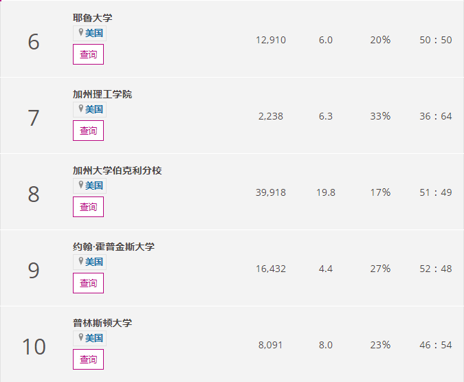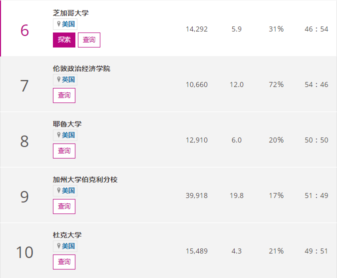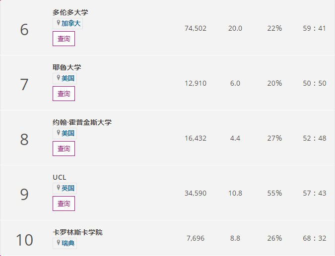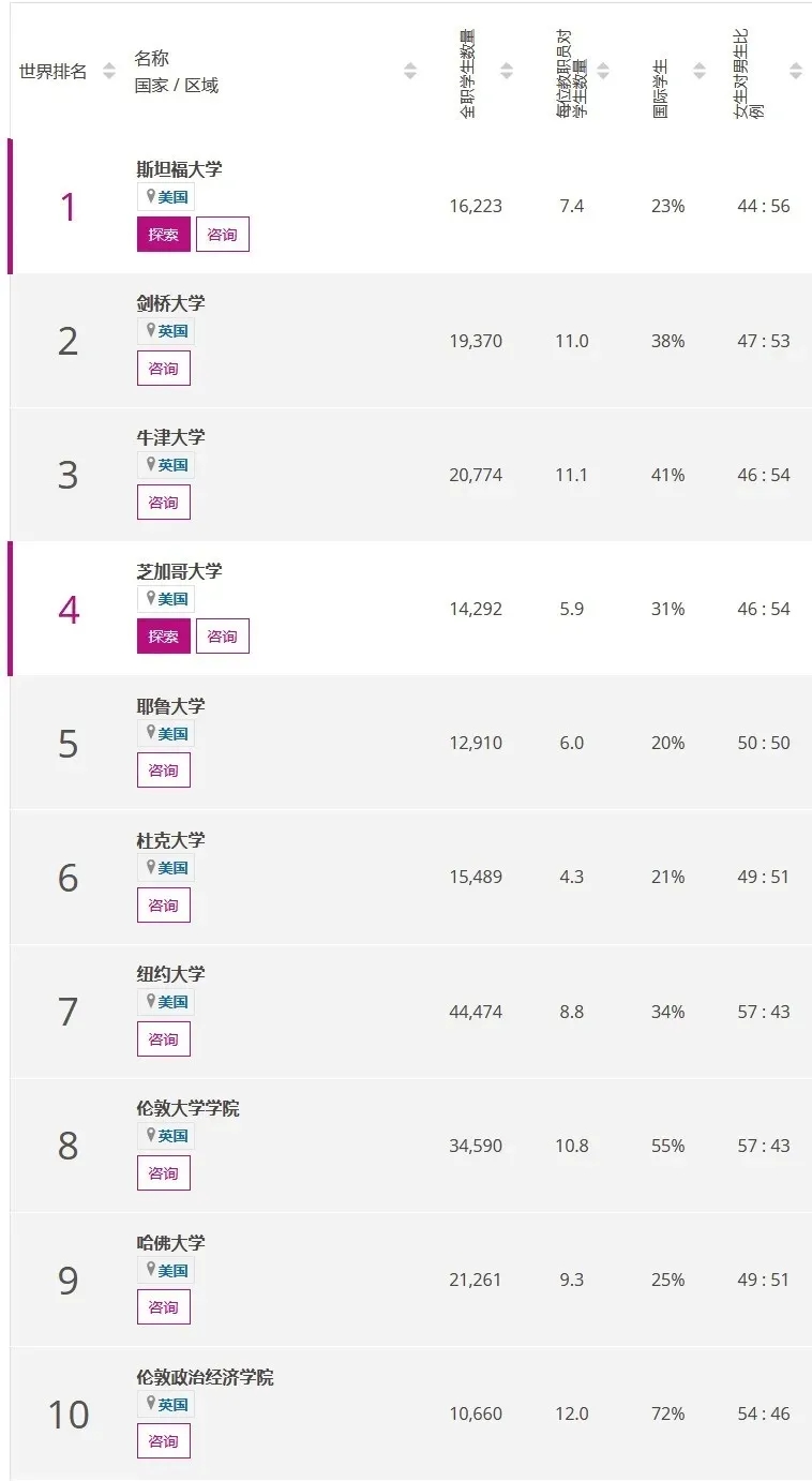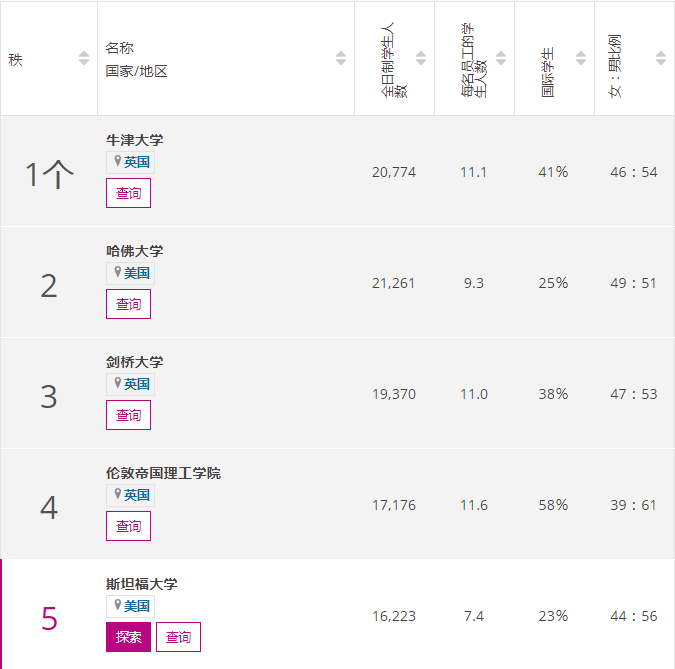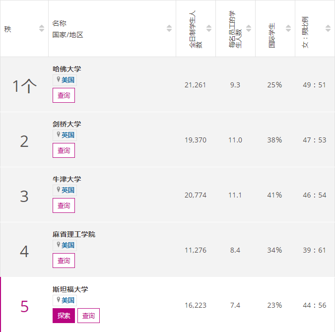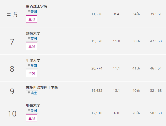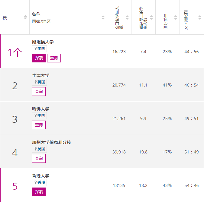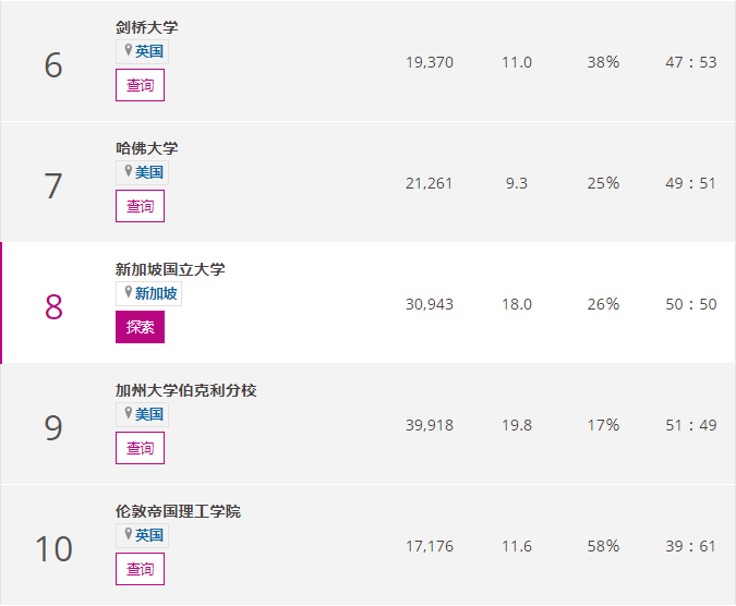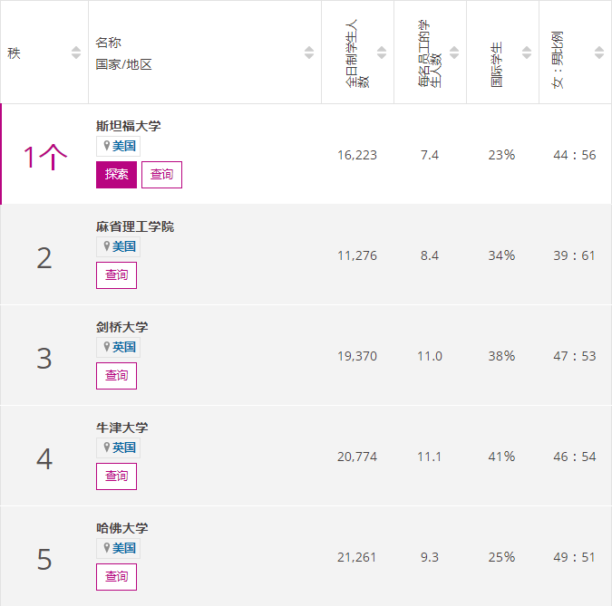 排行榜里,除了各学科每个院校的排名细分,我们还可以看到:学生人数、师生比例和国际学生百分比。