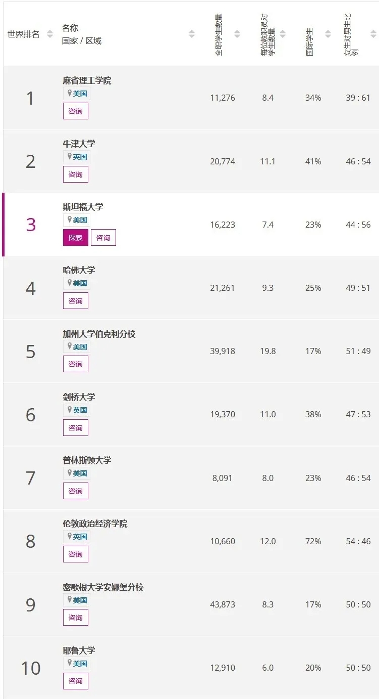 斯坦福大学(Stanford University)自2018年以来首次位居榜首,而哈佛大学(Harvard University)上升5位至第五名,这是自2017年以来的最高排名。同时,耶鲁大学(Yale University)上升3位,位于第八名,而宾夕法尼亚大学则跌出前10。