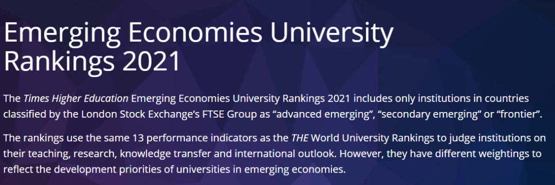 该排名仅包括由富时指数(FTSE)界定的“先进新兴经济体”、“次级新兴经济体”和“前沿经济体”国家或地区的高校。